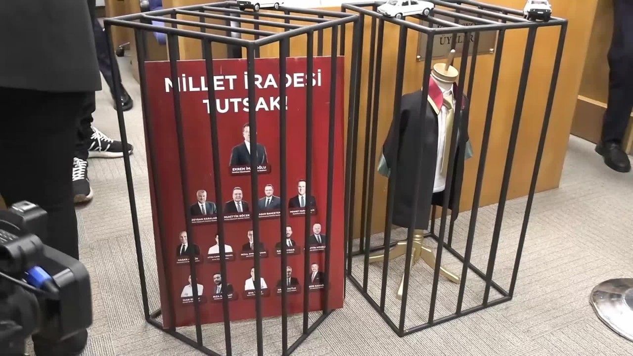 CHP milletvekilleri salona, tutuklu belediye başkanları ve bürokratların fotoğraflarının yer aldığı temsili bir cezaevi hücresi ve “Ekrem İmamoğlu’na özgürlük” yazılı dövizlerle katıldı.