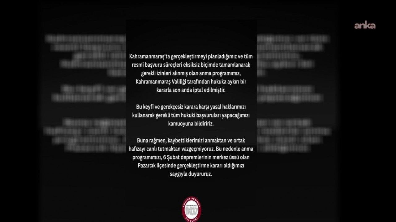 Adalet Peşinde Aileleri Platformu, Kahramanmaraş’ta 6 Şubat depremlerinin yıl dönümünde yapılması planlanan anmanın Valilik kararıyla iptal edildiğini duyurdu. Platform, kararı “hukuka aykırı ve keyfî” olarak niteleyerek hukuki yollara başvuracaklarını açıkladı. Anmanın Pazarcık’ta yapılacağı bildirildi.